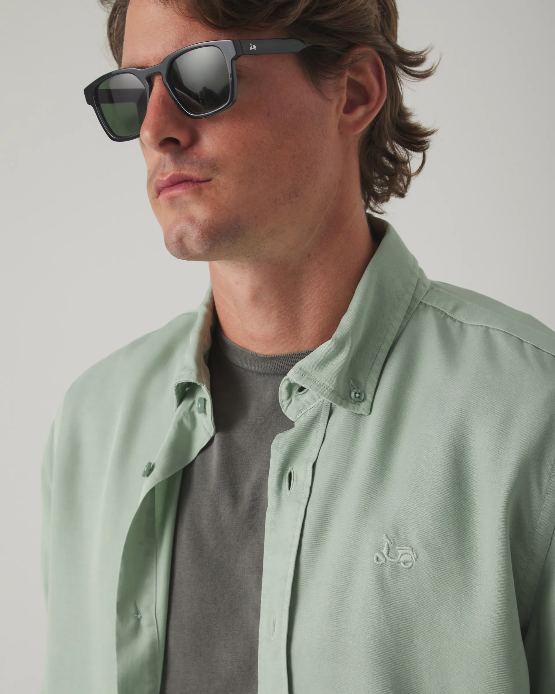 Camisa verde grisáceo confeccionada en tencel con corte regular fit. Cuello button-down, manga larga con puño abotonado y cierre frontal con botones personalizados. Acabado garment dyed: técnica que hace que el color, con el paso del tiempo y los lavados, adquiera un tono único. Detalle de moto bordada en el torso. Fabricada en Portugal.