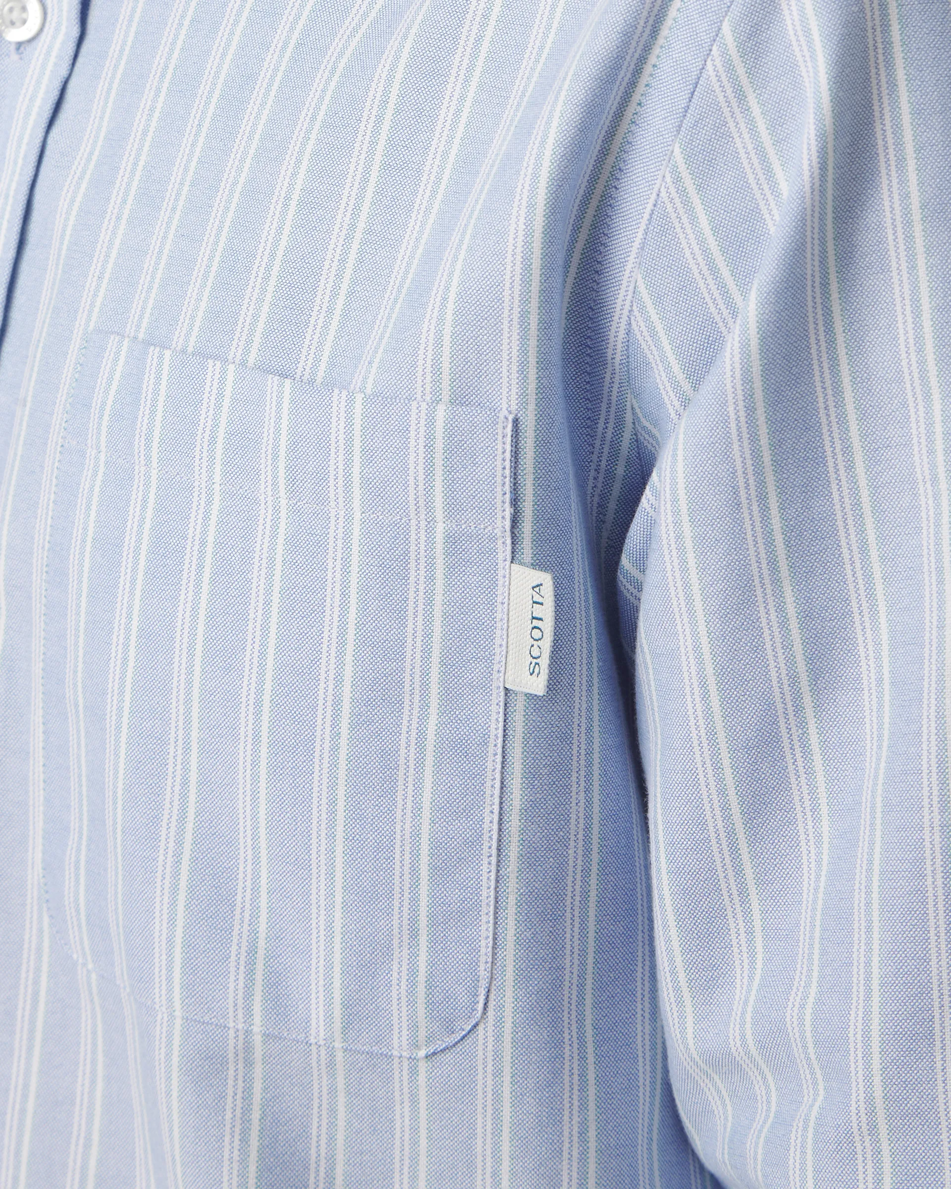 Camisa de rayas azul, confeccionada en algodón orgánico con corte regular fit. Cuello italiano, bolsillo, manga larga, con puño abotonado y cierre frontal con botones personalizados. Detalle de etiqueta. Fabricada en Portugal.