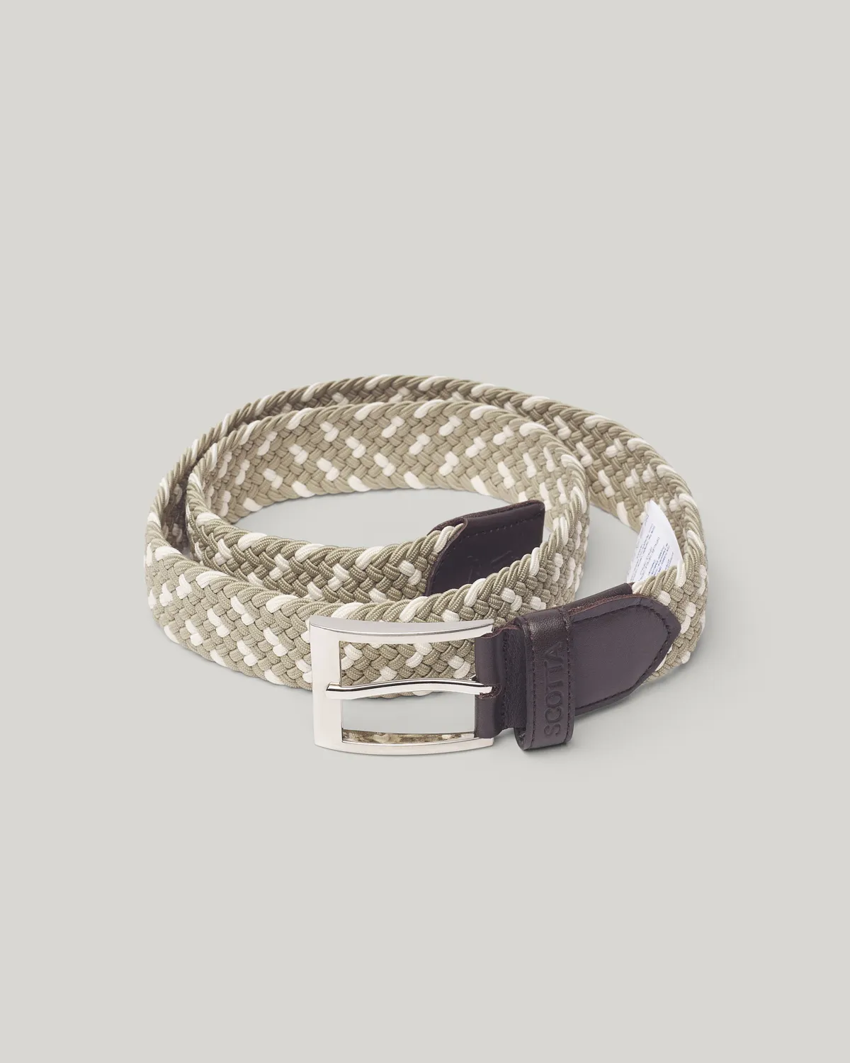Cinturón trenzado verde grisáceo. Cinturón confeccionado en tejido de poliéster y elastodieno. Extremos acabados en piel. Trabilla personalizada y logo grabado. Cierre con hebilla metálica.