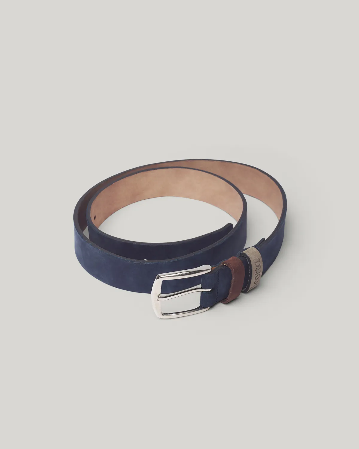 Cinturón de piel azul marino. Confeccionado en piel. Cierre con hebilla metálica. Trabilla personalizada. Logo grabado.