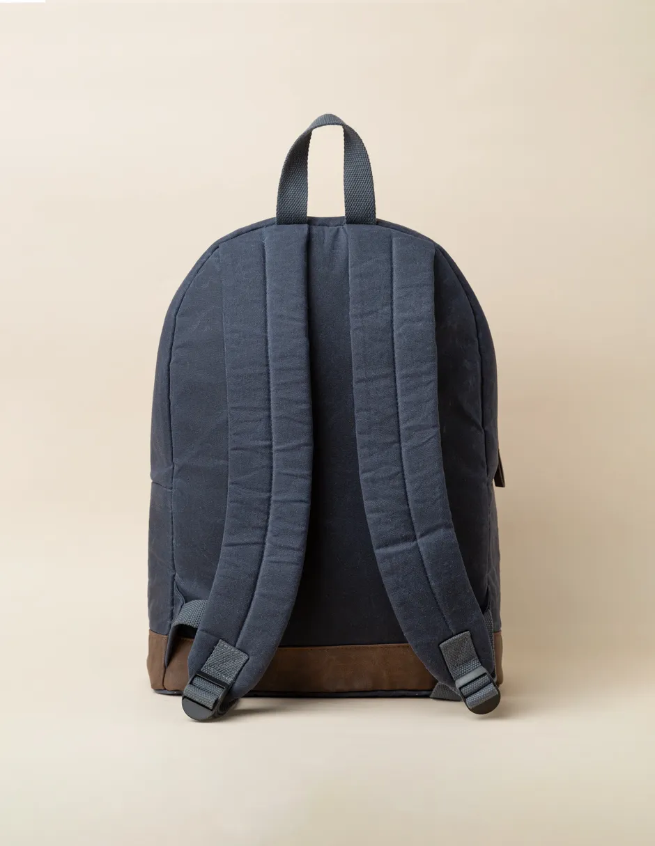 Mochila de tela azul marino. Confeccionada en algodón, poliéster y poliuretano. Cierre con cremallera. Bolsillo frontal. Con bolsillos interiores y forro interior de motos.
