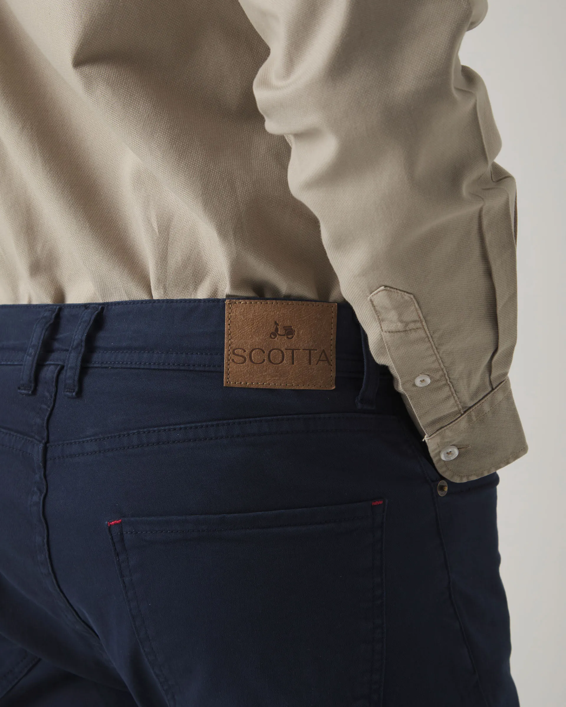 Pantalón 5 bolsillos marino de corte slim fit. Confeccionado en mezcla de algodón y elastano que aporta libertad de movimiento. Cierre con botón personalizado y cremallera, trabilla en cintura y bolsillos delanteros y traseros. Detalle de moto bordada en bolsillo y etiqueta personalizada trasera. Acabado garment dyed: técnica que hace que el color, con el paso del tiempo y los lavados, adquiera un tono único. . Fabricado en España.