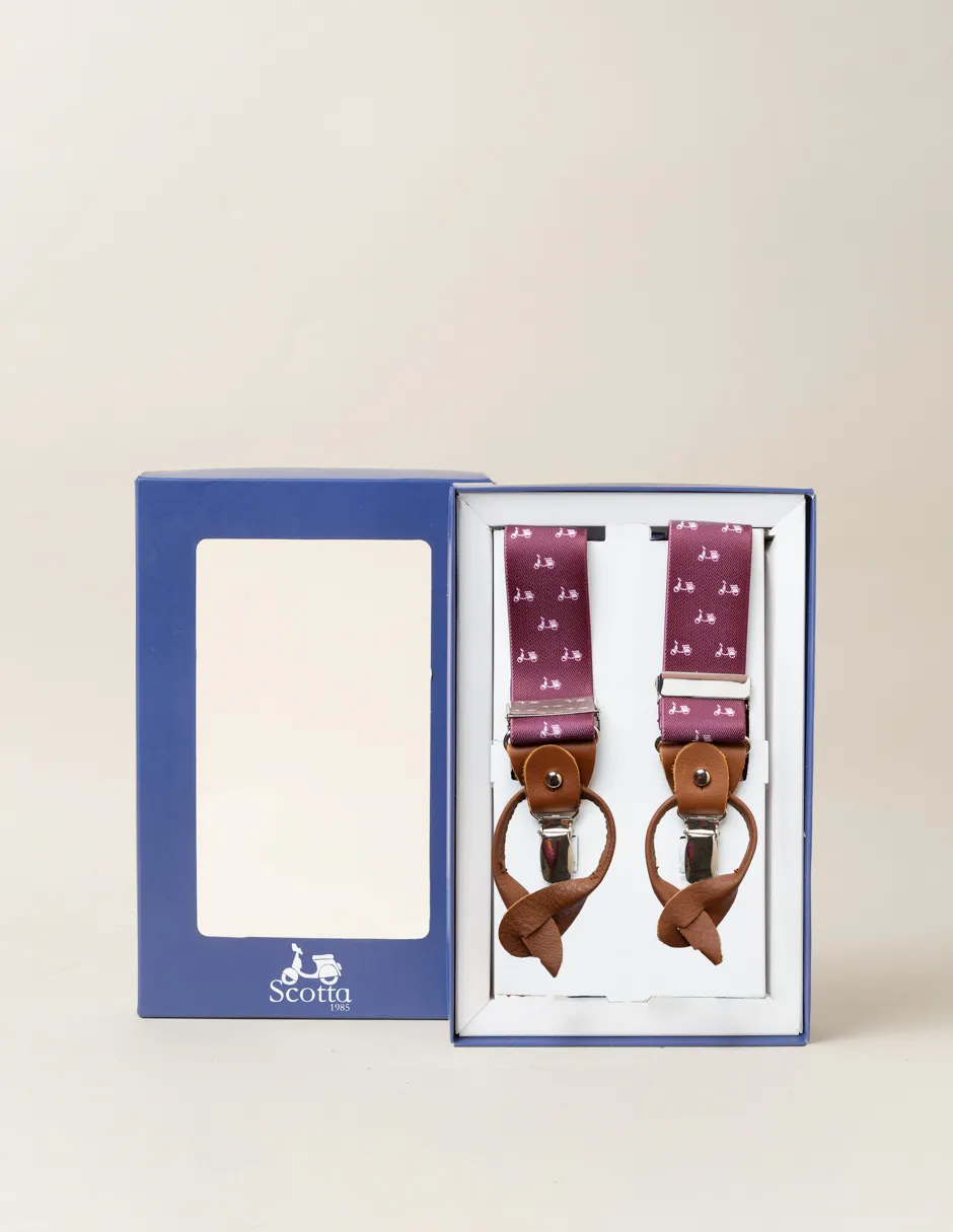 Tirantes de motos.. Tejido ligeramente elástico. Detalles en piel con logo grabado a fuego. Estampado de motos y sujeciones de pinzas con opción de latiguillo.